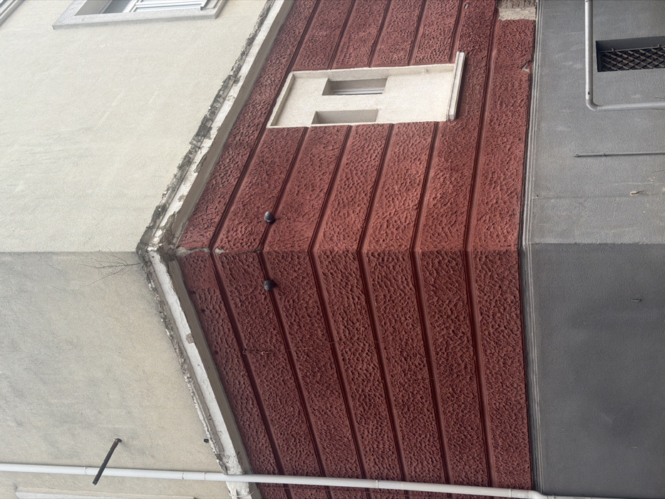 The image depicts the exterior corner of a multi-storied building located in Sofia, Bulgaria. The building facade is stratified into three distinct horizontal sections. The uppermost visible section is a light beige or off-white stucco, appearing weathered. Below this, a heavily damaged white cornice, exhibiting significant chipping and paint loss, separates the top section from the middle. From this damaged cornice at the corner, a small, bare-branched sapling or bush protrudes. The middle section of the building features a dark red or terracotta-colored stucco finish, characterized by a rough, pebbled texture arranged in horizontal bands. Two small, dark, dome-shaped objects, possibly security cameras or sensors, are mounted on this red wall near the corner, positioned diagonally relative to each other. On the right side of the red section, a tall, narrow, light beige-framed window unit is recessed into the wall, featuring two vertical panes. A white vertical downspout runs down the left side of the building, traversing the beige and red sections. To the left of the downspout, a short, dark-colored horizontal pipe protrudes from the beige upper wall. The lowermost visible section of the building is a dark gray stucco finish. At the bottom right, a small, dark, grated window is partially visible, protected by a light-colored metal rail. The overall lighting suggests an overcast sky. No individuals or active interactions are present in the scene.