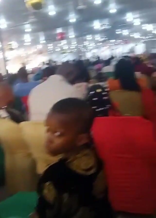 large room full of people sitting in red, green, and yellow chairs. There are children in the foreground, and adults throughout the room. The room is decorated with lights and reflective orbs hanging from the ceiling. The lighting in the room is bright. There is activity throughout the room with people moving around and talking. The video is a little shaky and the view is obstructed at times. A window is visible on the right side of the frame, partially obscured by a green curtain. The video appears to have been shot on a Tecno Spark 9T phone.