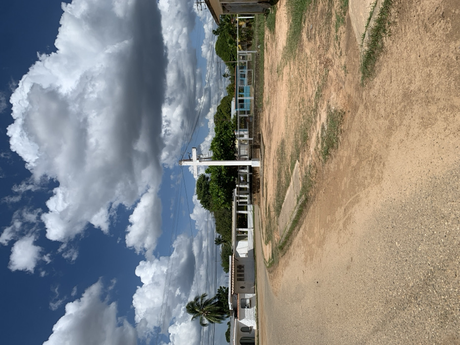 A white cross stands against a backdrop of a blue sky filled with fluffy white clouds. Green trees line the horizon behind the cross. A dirt road is on the right side of the image. On the left, a white building with red roofing is seen, a palm tree beside it. Overhead power lines run parallel.