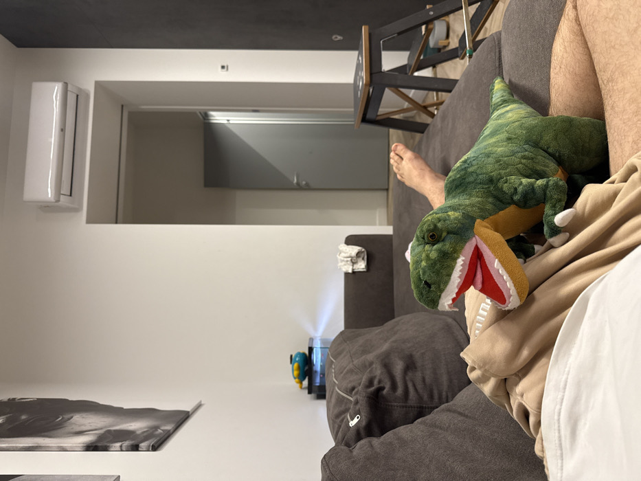 An indoor scene depicts a person relaxing on a dark gray sofa, with their bare lower legs and feet visible, along with a light-colored garment covering their lap. Resting on the person's lap is a green plush Tyrannosaurus Rex toy with an open mouth revealing red and white interior details. To the left, another section of the dark gray sofa is visible, with a folded light-colored cloth resting on its back. Behind the sofa, on a dark surface, a small blue and yellow device, possibly a projector, emits a beam of light onto the white wall. Above this, a framed black and white artwork, depicting part of a human face, hangs on the white wall. A white split-unit air conditioner is mounted high on the white wall, above an open doorway. Through the doorway, a light gray door with a silver handle is partially visible, leading into an adjacent space. To the right of the scene, against a dark gray wall, a black two-step stepladder with wooden treads is positioned. The flooring beyond the sofa appears to be a light-colored hard surface.