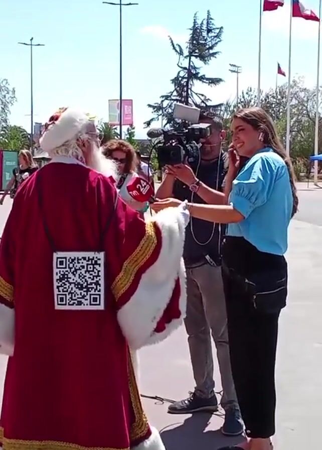 The scene shows a person dressed as Santa Claus being interviewed by a reporter in an outdoor setting. Santa is wearing a traditional red suit with white fur trim and a QR code hanging around his neck. The reporter, a young woman with long brown hair, is wearing a light blue blouse and black pants. She is holding a microphone towards Santa. A cameraman stands behind her, filming the interaction. In the background, there are Chilean flags waving, lampposts, trees, and people walking around. The sky is clear and the weather appears to be sunny.