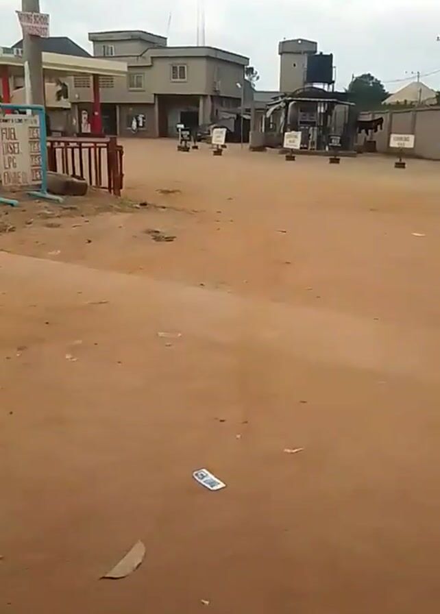 The video depicts a sparsely populated area, likely a small town or village, on a cloudy day. The ground is a reddish-brown dirt. In the background, there's a two-story building with gray walls and a flat roof. A tall antenna is visible behind the building. There's also what appears to be a small gas station with a canopy and fuel pumps. The prices for fuel, diesel, LPG and engine oil are listed on a blue stand. A small pile of dirt is located near the price stand. A few people can be seen in the distance, and utility poles and wires are scattered throughout the scene. The overall atmosphere appears quiet and uneventful.