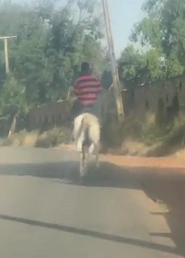 A person in a red-and-black striped shirt rides a white horse on a paved road, with power lines and vegetation visible in the background. The person and horse move away from the camera. Traffic and buildings appear in the distance. The environment seems to be a sunny, rural area.