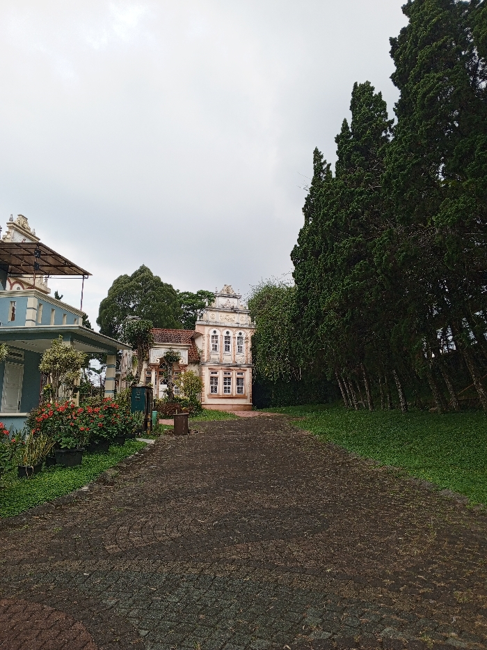 The image depicts an exterior scene in Weintiapa, Liberia, featuring a paved pathway leading towards multiple ornate buildings under an overcast sky. In the foreground, a dark-colored, textured pathway, possibly asphalt or cobblestone, extends from the bottom of the frame towards the midground. It is bordered on both sides by green grass and low-lying vegetation. On the left side of the midground, a light blue building with white trim and a white door is partially visible. An elevated structure with a dark metal frame and a roof extends from this building, forming a covered patio or porch. Below this structure, a dense cluster of red flowering bushes, other green plants, and potted vegetation are arranged. A dark green utility box and a small brown cylindrical planter are positioned near the edge of the pathway in this area. Further along the path, centrally located, stands a two-story building with a light cream or beige facade. This building features multiple rectangular windows with white frames and sills, and a distinctive ornate gabled roofline with decorative elements. A smaller, older-looking building with a reddish-brown roof is partially visible behind and to the left of this prominent structure. On the right side of the midground, a dense row of tall, dark green evergreen trees, possibly cypress, forms a natural barrier, extending into the background. Several of these trees exhibit a slight inward lean towards the pathway. The ground beneath these trees is covered in green grass. The background consists of additional dense green foliage and trees, receding into the distance. The sky above is uniformly light gray and completely overcast, indicating a cloudy day. No individuals, specific actions, or interactions are present in the scene.