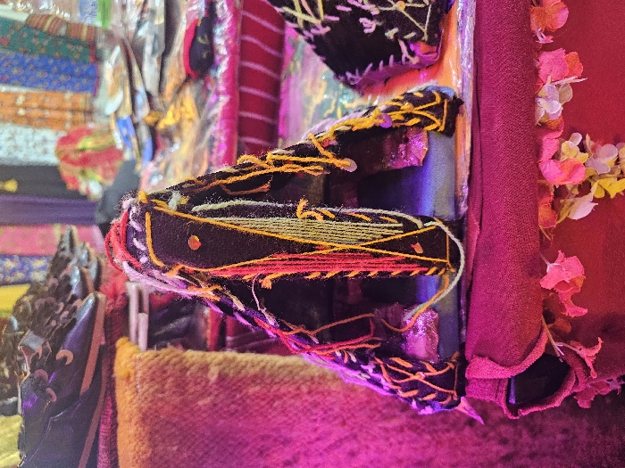 An artistic close-up reveals a textile arrangement. Dark, fabric-covered structures are adorned with colorful threadwork. One section displays a horizontal line of yellow and red thread, punctuated by a small stud. To the right, a textured red fabric is accented with scattered petals and leaves. Further back, various colorful fabric rolls add depth. A dominant pink light casts shadows and enhances the vibrancy of the colors.