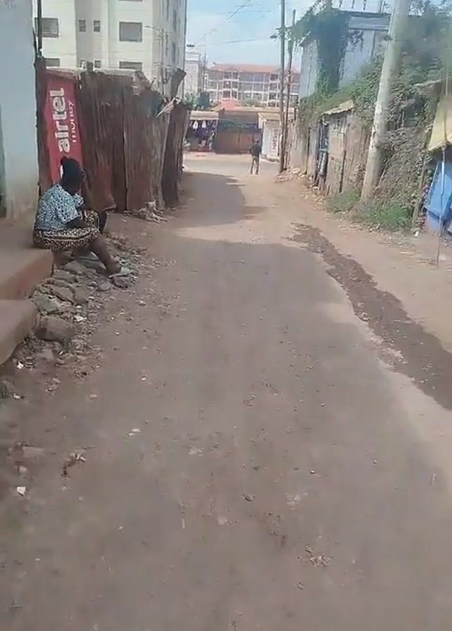dirt alleyway in what appears to be a lower-income area. A tall building is visible in the background. On the left side of the alley, two women are sitting on a concrete step. A large Airtel advertisement is behind them, partially obscured by corrugated metal. A dog lies on the ground nearby. On the right side of the alley, there is a corrugated metal structure covered with blue tarp. A man walks away from the camera down the alley. Debris is scattered along the sides of the alley. The sky is bright blue with some clouds.