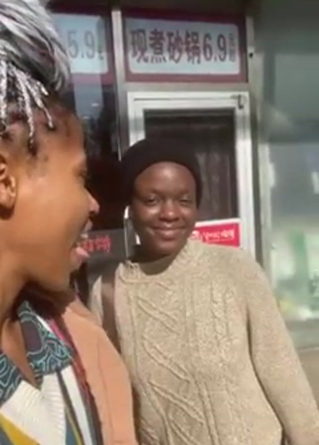 Two women stand side-by-side in front of a storefront with Chinese signage