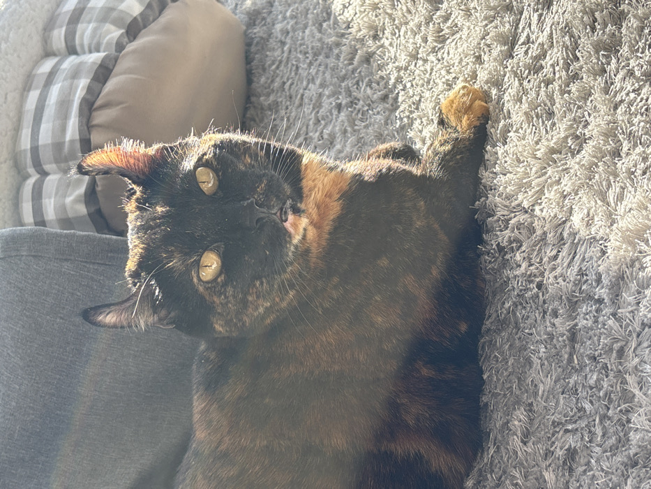 - "A tortoiseshell cat with piercing yellow eyes lies on its back in a patch of sunlight" by FM-zY3Zo1, licensed under CC BY 4.0