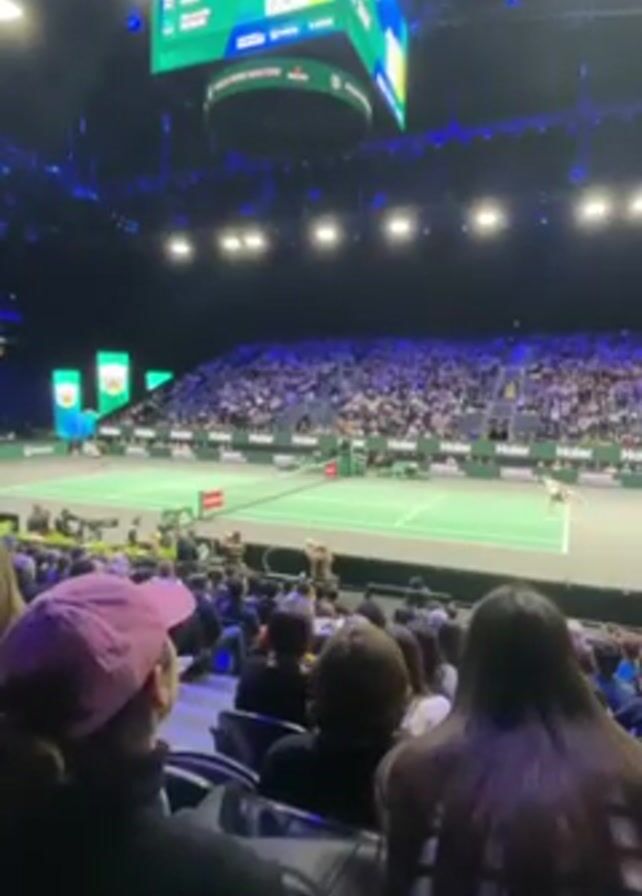 A tennis match is underway inside a large, brightly lit arena filled with spectators