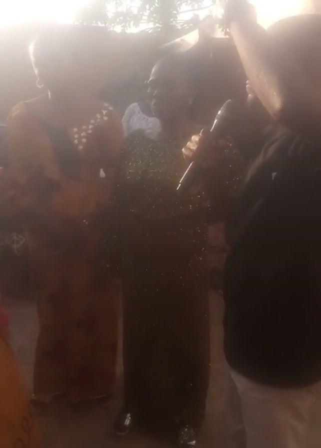 The video depicts three individuals standing in what appears to be an outdoor setting with bright sunlight creating a strong backlight. A man on the right is holding a microphone and gesturing with his other hand. He is wearing a black t-shirt and white pants. To his left, a woman in a dark, possibly green, dress is standing and looking towards the man with the microphone. Another woman, wearing a brown dress with embellishments on the bodice, stands to her left. The sunlight makes it difficult to see details of the surrounding environment, but there appears to be some kind of structure or awning in the background.