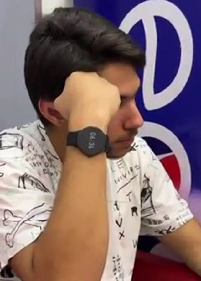 A young man is sitting at a red table with his left arm propped up and his fist supporting his head. He wears a black digital watch on his left wrist. He has short brown hair and light facial hair. The man is wearing a white t-shirt with a black ink splatter pattern. Behind him is a large blue sign with the white Pepsi logo. The camera zooms in on the man's face. He looks towards the camera and then looks down.