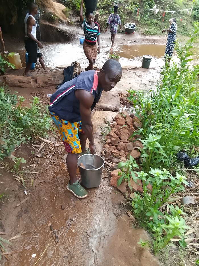 A man in a blue vest and patterned shorts carries a bucket filled with water at a muddy riverbank. Other individuals are seen in the background near a body of water, some carrying containers. The scene is surrounded by greenery, including tall grasses and foliage. Rocks are arranged near the man as if to construct a barrier. The setting suggests a rural or village environment where water collection is a common activity.