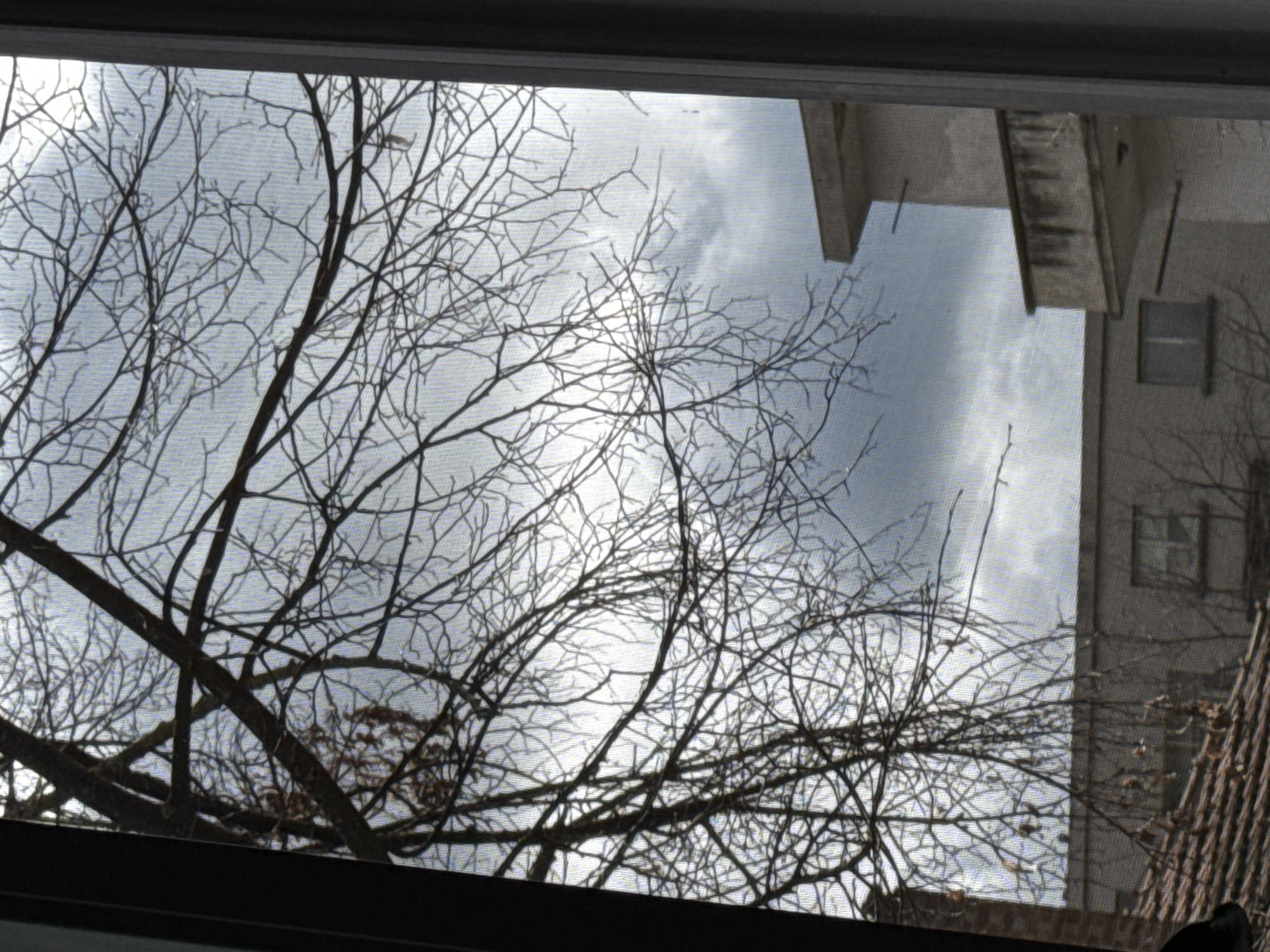 view from a window, likely in Pleven, Bulgaria. Through the window screen, bare tree branches are visible against a cloudy sky. A building is partially visible on the right side of the frame, featuring what appear to be windows. The scene is shot from indoors, looking out. No people are visible. The environment appears to be urban, given the presence of buildings. The light suggests it is daytime.