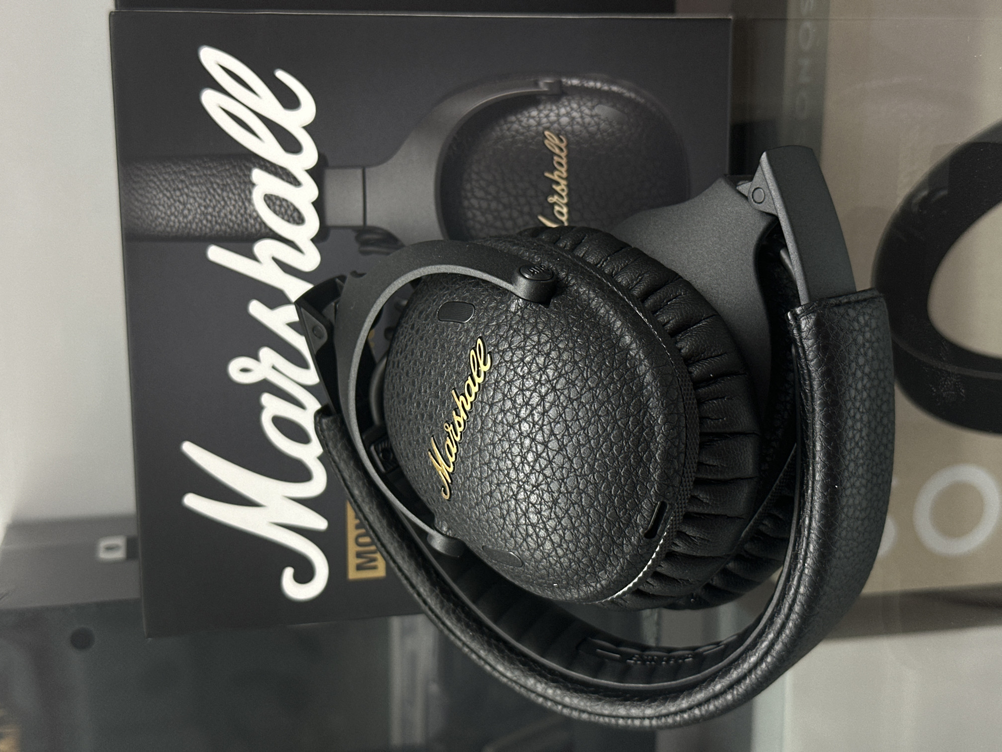 A pair of black Marshall headphones rests on a black Marshall box, which is in turn on a glass surface. The Marshall logo is prominent on the headphones and box in gold and white lettering respectively. The scene is illuminated by ambient light, and a small portion of a Sonos speaker is visible in the background on the right. The location of the scene is not discernible from the image.