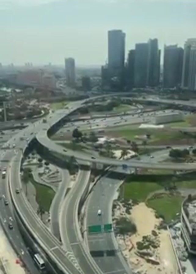 The video presents a high-angle view of a sprawling cityscape under a partly cloudy sky. Dominating the foreground is a complex highway interchange with multiple overpasses and on-ramps, showing moderate traffic. Beyond the interchange, a cluster of modern skyscrapers stands tall, their glass facades reflecting the daylight. Patches of greenery, including grass and trees, are visible around the roadways and between buildings, adding a touch of nature to the urban landscape.