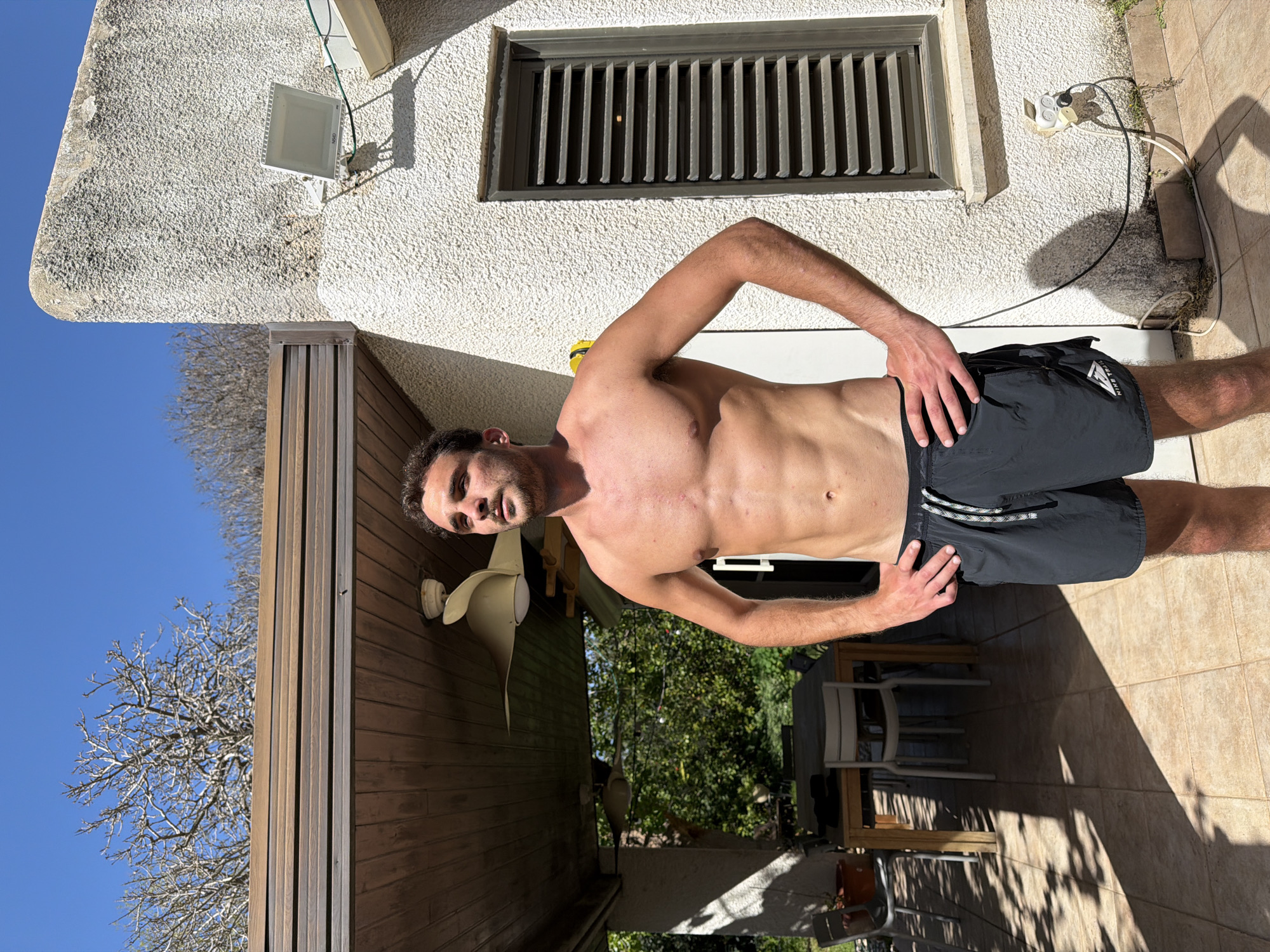 This image depicts an outdoor residential scene in Hofit, Israel, on a clear, sunny day. An adult male, appearing to be in his 20s or early 30s, stands shirtless with a muscular physique and short dark hair, wearing dark athletic shorts with a white drawstring and a "Nike Trail" logo on the left leg. He is positioned on light-colored tiled paving, with his hands on his hips, looking slightly upward and to his left. To the left of the male subject, a covered patio area is visible, featuring a dark brown slatted wooden ceiling with a white ceiling fan. Further back within the patio, a wooden dining table is surrounded by various chairs, and a potted plant is on the ground. Beyond the patio, lush green foliage and trees are present, with string lights strung within the greenery. Strong sunlight casts distinct shadows onto the tiled ground in this area. To the right of the male subject, a white, textured stucco wall of a building is prominent. Mounted on this wall are a white rectangular floodlight and, closer to the ground, an electrical outlet with cables connecting to a dual-port adapter. A window with dark horizontal louvered blinds is also set into the wall. Above the patio roof and the building, a clear blue sky is visible, against which the bare, leafless branches of several trees are silhouetted.