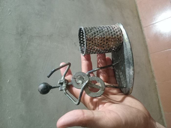 A hand holds a sculpture made of metal pieces. The front resembles a bicycle with a circular head, two stacked washers for the body, and curved pieces for the handlebars and legs. Behind the bicycle, a cylindrical, perforated metal piece is attached to a flat, oval metal plate. The entire sculpture appears aged and slightly corroded. The background includes a gray wall and a section of brown tiles.