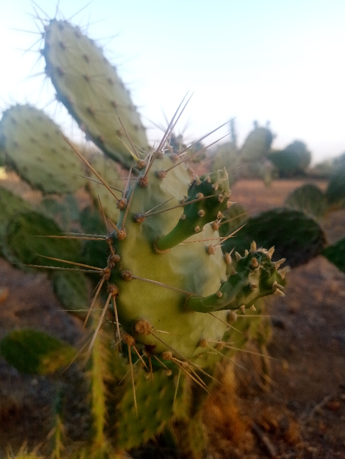 A close-up shot reveals a vibrant green prickly pear cactus