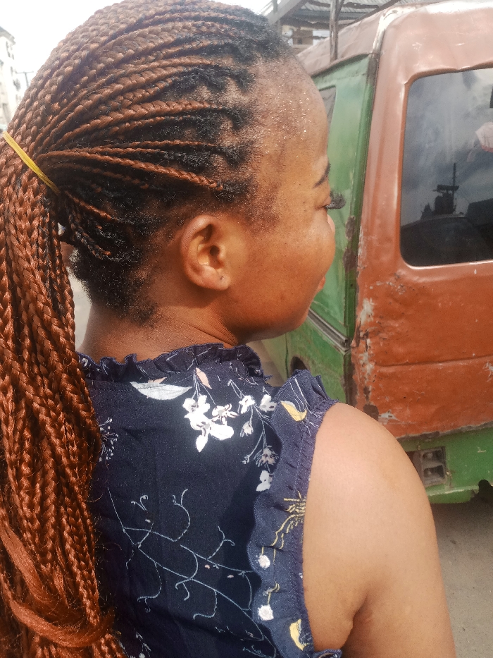 The image captures an adult female from the back and right profile, situated in an outdoor urban setting within Ura Nta Umuarandu, Nigeria
