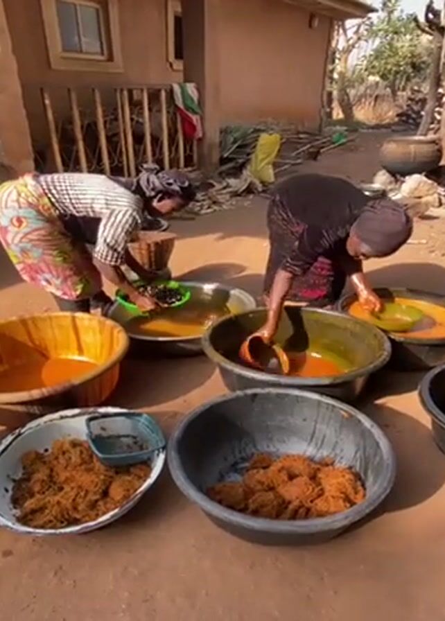 Two women are working outdoors, possibly processing palm oil. They are positioned in front of a building with a wooden porch and a window. One woman wears a patterned shirt and headscarf, and is seen placing dark palm fruit into a bowl of orange liquid, likely oil. She has a basket next to her. The second woman, dressed in a dark-colored garment and headscarf, is extracting oil from the fruit using a coconut shell-like tool, and places the extracted oil into a bowl. There are several large bowls around them. Some bowls contain the orange liquid oil, while others are filled with a fibrous brown substance. The ground is reddish, and the overall environment suggests a rural setting.