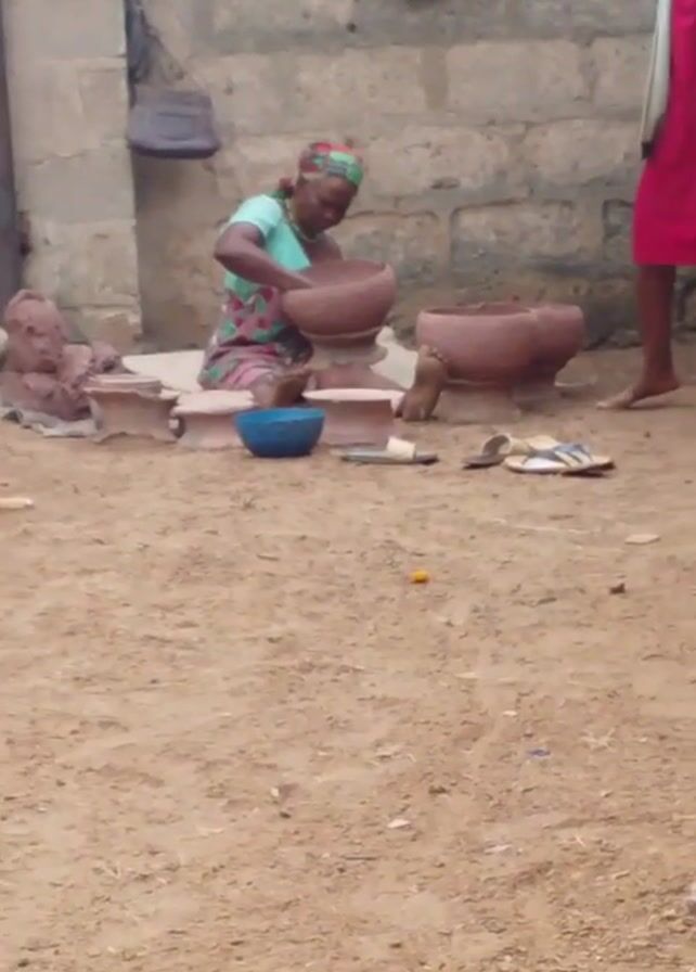 A woman in a headscarf and patterned dress is kneeling and working on a large clay pot. The pot sits on a stand in front of her. There is a blue bowl, a knife, and a pair of sandals near her. Behind her is a cinder block wall. Clothes are hung on the wall, and a grey bag is hung on a nail. To the woman's left is a pile of clay. A dog is lying down in the foreground. A woman in a red dress walks into the frame at the right. The ground is dirt.