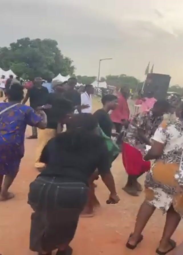 The scene captures a lively gathering of people outdoors. Several individuals are dancing enthusiastically on a reddish-brown dirt ground. The crowd is diverse in appearance and clothing. There are men and women in varying attire, including colorful dresses, casual shirts, and dark clothing. One woman in the center of the frame, wearing a black top and jeans, dances energetically with a microphone in her hand, tilting her head back and laughing. The background reveals a partially overcast sky, a few large trees, and tents set up in the distance. A speaker is visible on the right, suggesting music is playing. People in the background are milling around, some seemingly observing the dancing, while others are engaged in their activities. The overall atmosphere appears celebratory and festive.