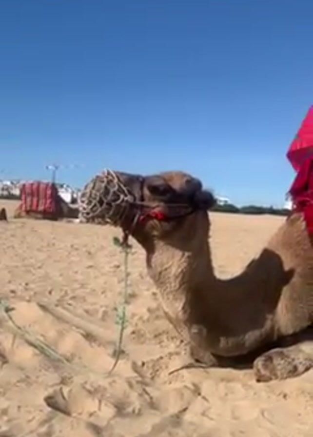 camel lying on the sand. It has a net-like muzzle on its face and a red blanket with the Moroccan flag draped over its back. The camel is secured with a green rope. The sand is light in color. In the background, there is a clear blue sky. Other camels and what appears to be a building can be seen in the distance. Someone is speaking, mentioning "collective memory" and saying "be proud."