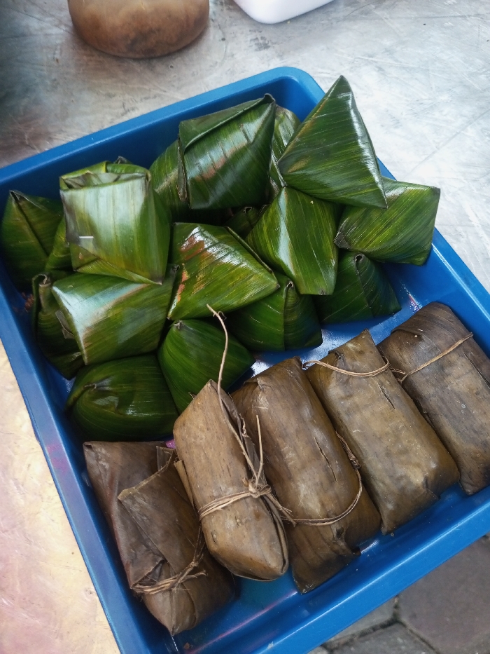 A blue tray overflows with traditional Southeast Asian snacks. The upper section presents multiple vibrant green, pyramid-shaped parcels, likely made with banana leaves. Below them, there are rectangular packages wrapped in faded brown leaves, and secured with twine. The entire arrangement is a showcase of rustic packaging and local cuisine.