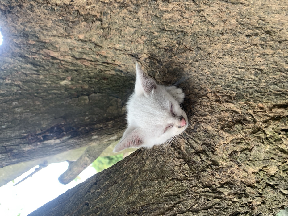 - "A small, white-furred kitten is observed sleeping within a natural crevice formed by two large, rough-barked tree trunks" by FM-rAZOw1, licensed under CC BY 4.0