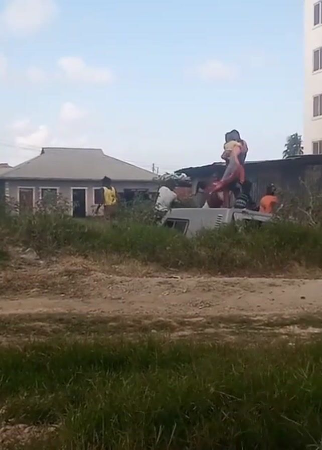 A static, eye-level shot shows several people gathered on top of an overturned white vehicle in a weedy, dirt-covered lot. One person, wearing a red garment, is holding a child. Other individuals are standing and sitting on the vehicle. They are wearing various colored shirts, including yellow, white, and orange. A small, one-story building with a gray roof is visible behind the vehicle, and a taller building can be seen in the background to the right. The foreground is filled with green grass and a dirt path. The sky is light blue with scattered clouds.