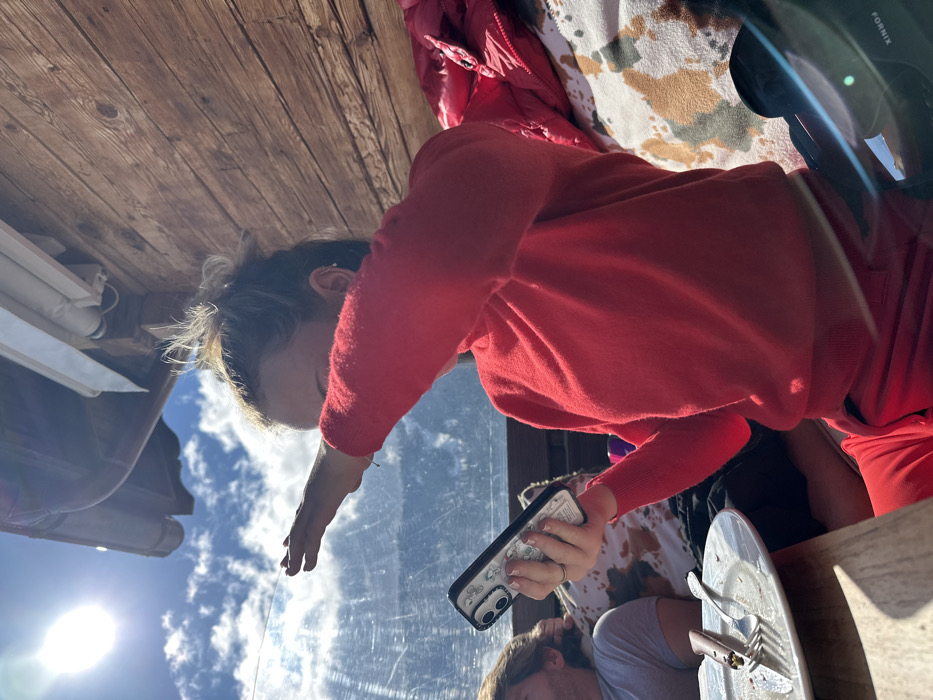 The image captures an outdoor scene in La Clusaz, France, depicting two individuals on a sunny terrace. The central figure is a female, seen from the chest up, wearing a red turtleneck sweater and matching red pants. Her hair is light brown, styled in a messy bun. She raises her left hand, shielding her eyes from a bright sun in the upper-left quadrant of the frame. Her right hand holds a white-cased smartphone, revealing light-colored nail polish. To her left, partially visible behind her, is a second individual with light-colored hair and a light-toned, possibly patterned, shirt. On a wooden table in the lower-left foreground, a white plate with food residue, a fork, and a knife with a brown handle are present. To the right of the central figure, a bright red puffy jacket rests on a cushion adorned with a brown and white cowhide-like pattern. The background features a wall constructed from horizontal wooden planks, suggesting a chalet-style building. Above this wall, a white roof gutter system is visible. The scene is viewed through a transparent barrier, possibly glass, which shows surface scratches. Beyond this barrier, a blurred mountainous landscape is visible under a clear blue sky scattered with white clouds. A bright sun flare emanates from the upper left. A black object marked "FORNIX" is partially visible in the bottom right corner.