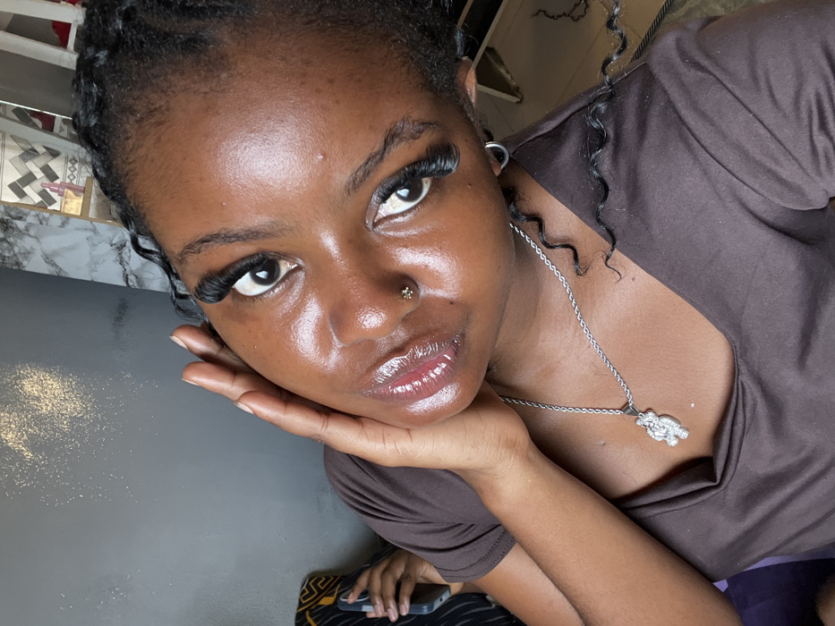 A dark-skinned individual is depicted in a close-up, head-and-shoulders portrait within an interior setting in Gbongan, Nigeria
