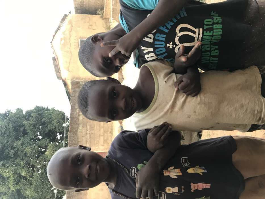 Three young, dark-skinned children pose for a photo. One at the top makes a peace sign. The child in the middle wears a white tank top. The child at the bottom wears a dark T-shirt with cartoon characters printed on it and a beaded necklace. A brick building and a tree are in the background. The image has been rotated.