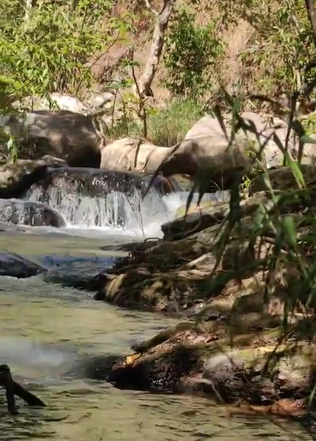small waterfall in a stream flowing through a wooded area