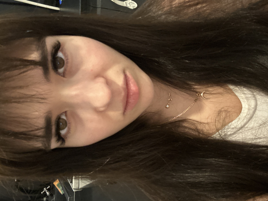 A woman with long, dark brown hair and bangs is looking directly at the camera. Her eyes are brown and she wears long, dark eyelashes. She has fair skin and is slightly smiling. A delicate gold necklace with a crescent moon charm is visible around her neck. She wears a white ribbed tank top. The image is slightly rotated.