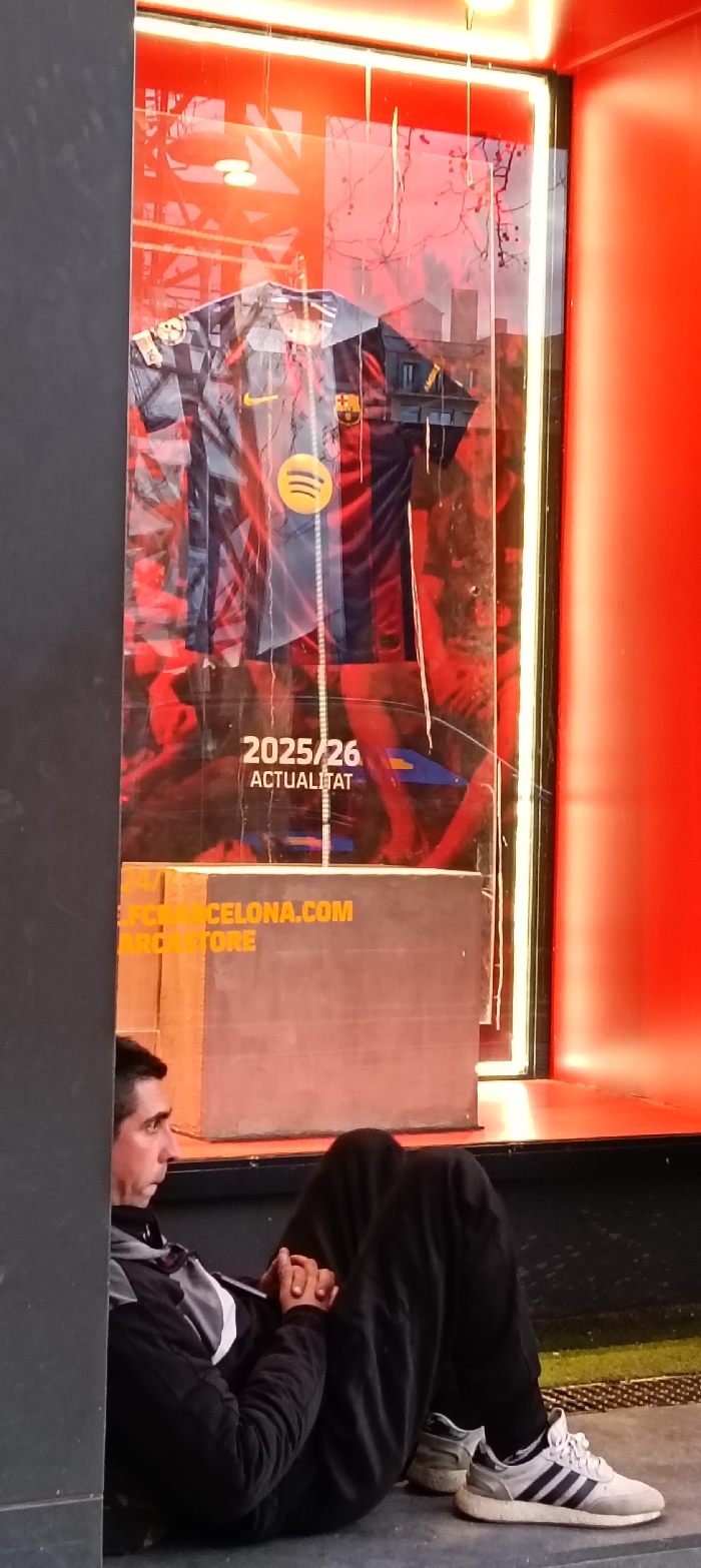 A person sits on the ground near a store display. The person wears black pants, sneakers, and a jacket. The display is for FC Barcelona, promoting the 2025/26 season. It features a soccer jersey with the Spotify logo, encased in a glass display case with red lighting and promotional text.