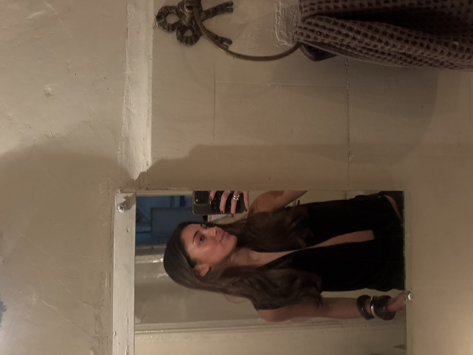 A woman stands in front of a mirror in a bathroom, taking a selfie. She wears a black shirt and has long brown hair. Her phone is visible in her hand. The bathroom has white walls and a decorative towel rack with a towel. The mirror is rectangular with a white frame. The lighting in the room is dim.