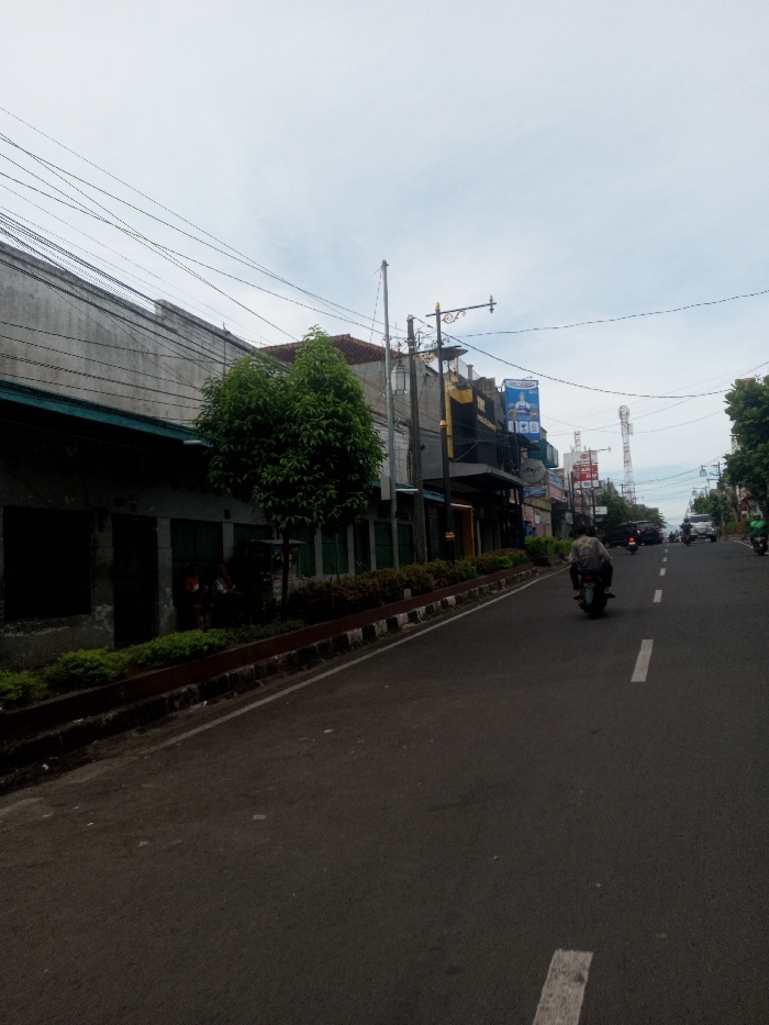 The image depicts a daytime street scene in the city of Phonsavan, Laos, under an overcast sky. A dark asphalt road, featuring a broken white center line and a solid white line marking its right edge, extends from the foreground into the distance. On the left, a continuous row of light grey, multi-story buildings with dark lower-level window or door sections and green awnings/shutters lines the street. Numerous black utility wires are strung overhead above these structures. A small, dense-foliage green tree is positioned in front of one building, separated from the road by a raised concrete planter containing low green shrubbery. In the mid-ground, a single individual wearing a light-colored, patterned long-sleeved garment operates a dark-colored motorcycle, traveling away from the camera in the left lane. Further down the street, additional vehicles, including cars and at least two other motorcycles, are visible, indicating traffic. The right side of the street in the mid-ground and background features more commercial buildings displaying various signs, notably a blue sign with white text/logo and a yellow sign. Multiple utility poles with decorative streetlights are present along the right side. A tall white lattice communications tower stands in the distant background, to the right of the road's center line.