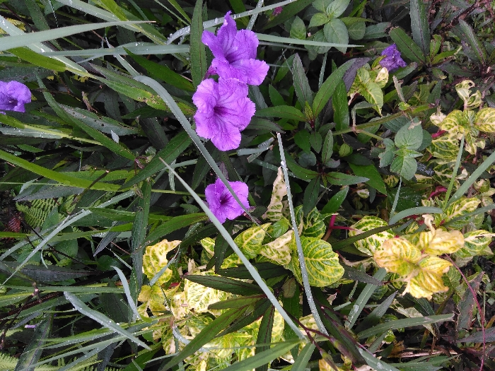 The image displays a dense botanical scene located in Chan-Nua, Laos, characterized by a variety of green foliage interspersed with purple flowers. Three open, trumpet-shaped purple flowers, consistent with *Ruellia simplex*, are prominently featured in the upper-right and central-right areas. A smaller, partially visible purple bloom is present in the lower-right. The vegetation includes numerous slender blades of green grass, several of which exhibit small, clear water droplets. Darker green, broad-leafed plants with some reddish stems are distributed throughout the background and midground. Clusters of distinct green and yellow variegated leaves are notable in the lower-left and mid-left sections. A fern-like plant structure is partially discernible in the upper-left background. The overall scene indicates lush, moist plant growth under natural ambient light.