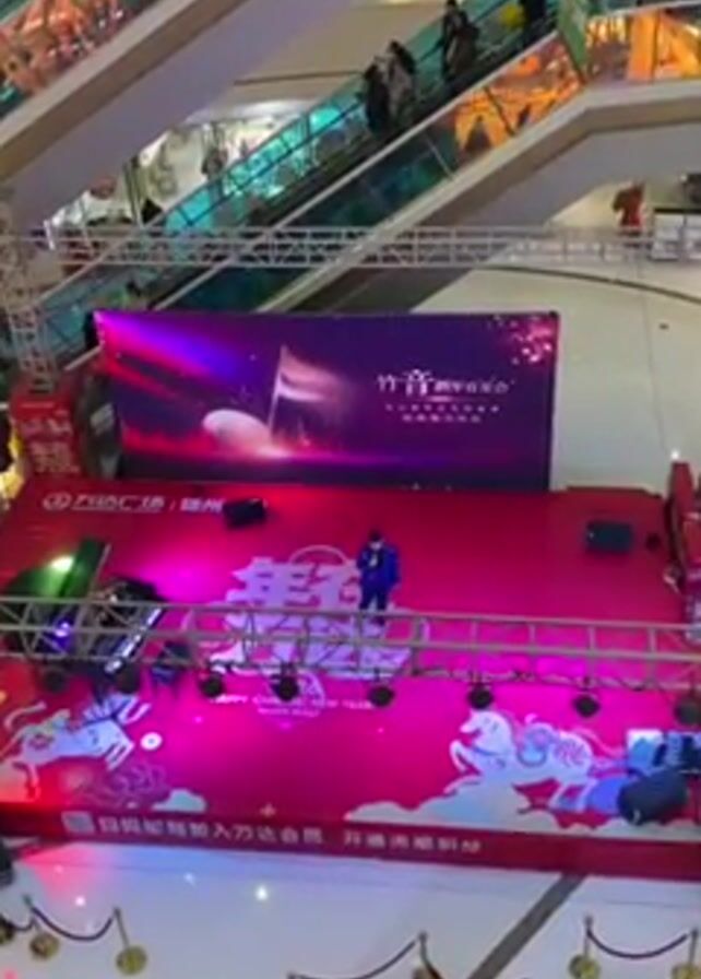From an elevated vantage point inside what appears to be a shopping mall, a stage with a red backdrop is visible