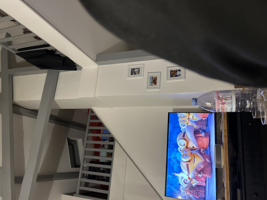 An interior scene depicts a lofted area with white walls and gray structural supports. Framed pictures adorn the wall above a television showing a cartoon. A water bottle rests near the television, partially obscuring the view. A black object is visible in the upper left corner. The overall image appears tilted, capturing an upward perspective.