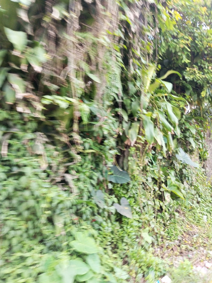 A heavily motion-blurred image depicts a dense aggregation of green foliage covering a vertical surface, likely an embankment or wall, in Kandenuwara, Sri Lanka