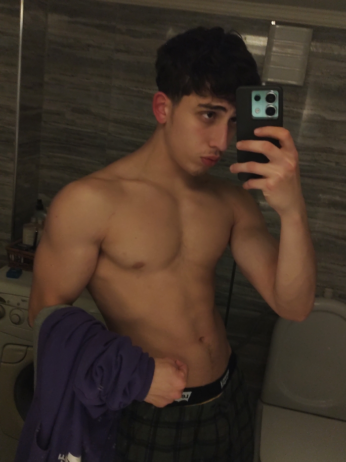 A shirtless young man poses for a selfie in a bathroom. His physique is visible, showing defined chest and arm muscles. He holds a phone in his right hand to capture the image. A purple garment is draped over his left arm, which is flexed. Plaid pajama pants with a visible branded waistband are around his waist. A washing machine, a toilet, and tiled walls are also present.