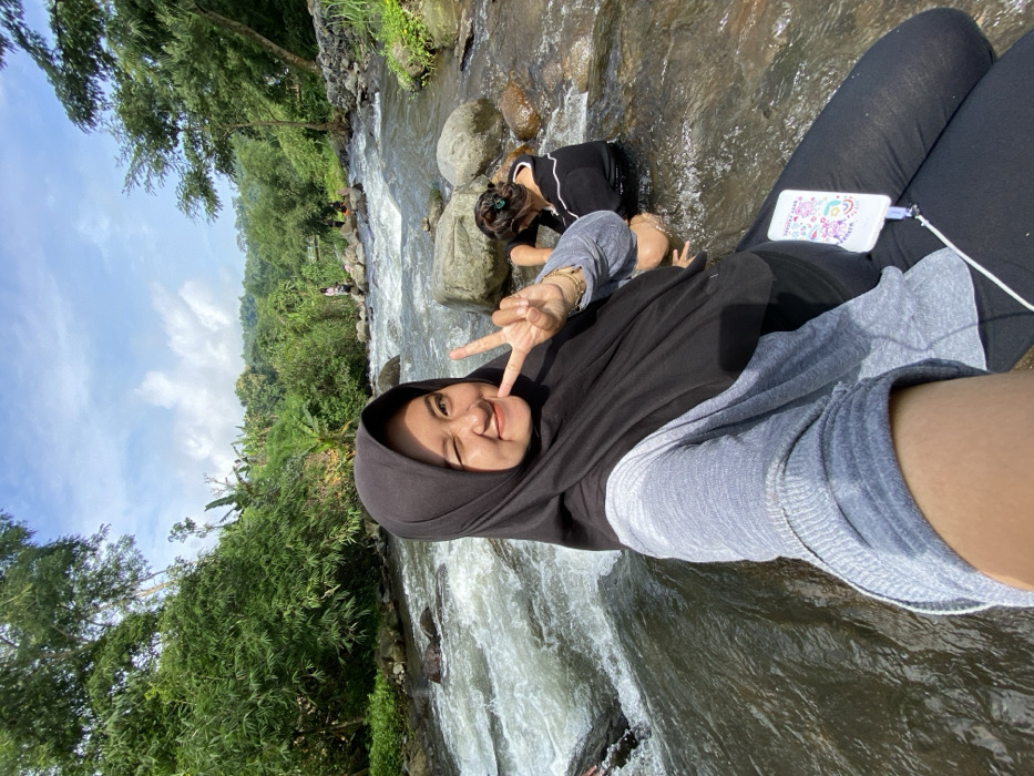 A selfie-style, slightly angled photograph depicts a woman in a hijab making a peace sign in a river