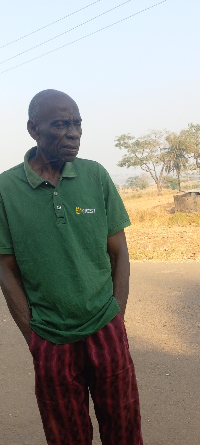 An elderly man stands outdoors. He wears a green polo shirt with a logo reading "BEST" and red patterned pants. His hands are in his pockets as he gazes off to the side. In the background, there's a landscape with dry grass, scattered trees, and a low, unfinished structure. Utility lines stretch across a clear, pale sky.