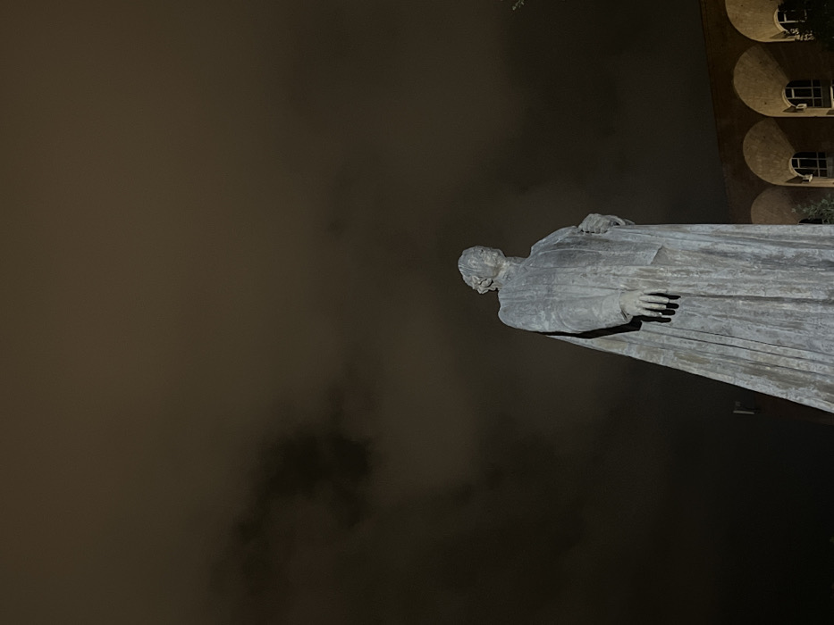 A bronze statue of Yeghishe Charents stands prominently in Charents Square, Yerevan, Armenia, at night
