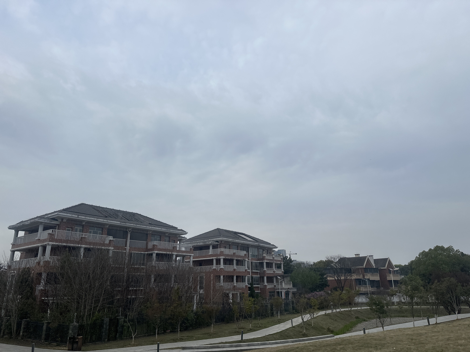 The image displays an overcast daylight scene situated in Jiangning District, China. The foreground features a gently sloping, manicured grass area with winding paved pathways. Small, deciduous trees with sparse foliage line these paths, accompanied by low-profile bollard lights. In the midground, a dark, spiked fence runs horizontally, behind which a dense line of mostly bare deciduous trees and some evergreen shrubs is present. Beyond this vegetation, three multi-story residential structures are visible. The two prominent buildings on the left are large, brick-faced structures with dark, tiled gabled roofs. They feature multiple levels of balconies with white pillars and railings. These buildings exhibit an appearance consistent with being unfinished or unoccupied, with some windows darkened or obscured. To the right, a third, smaller brick building with a distinct multi-gabled roof and a lighter-colored balcony structure is partially visible amidst trees. In the far background, beyond the buildings and dense tree line, a construction crane is discernible against the gray sky, indicating ongoing development in the wider area. No individuals, vehicles, or active subjects are present in the scene. The sky is entirely covered by a uniform layer of gray clouds.