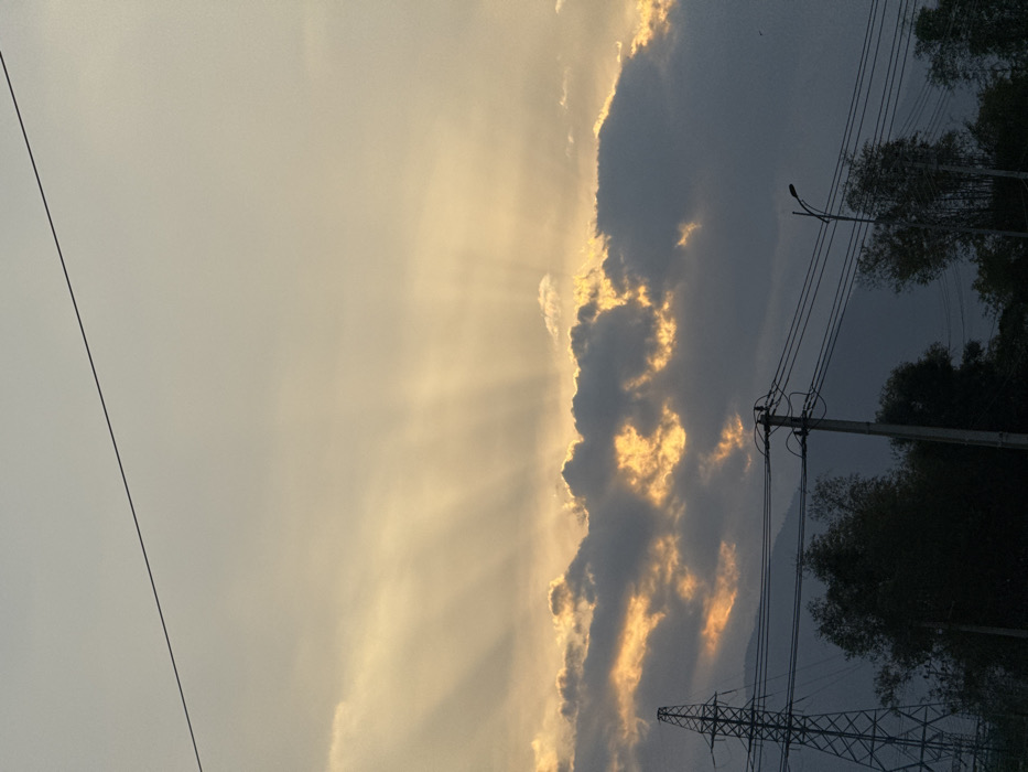 The image captures a landscape scene in Diên Khánh, Vietnam, at either sunrise or sunset. The upper half of the frame is dominated by a sky exhibiting crepuscular rays of golden-yellow light emanating downwards from behind a layer of clouds. Below this, a distinct band of dark grey clouds occupies the mid-ground, with bright golden-orange light illuminating their edges and breaking through in several areas, creating luminous voids within the darker cloud mass. In the lower left quadrant, a large, metal lattice-work electricity pylon is silhouetted against the sky and distant terrain. Multiple dark electrical lines traverse the middle and lower sections of the image, stretching horizontally across the frame. Two utility poles, one with a prominent street light fixture, are visible to the right of the pylon, also supporting electrical wiring. The lower portion of the scene features the dark silhouettes of treetops and vegetation. In the background, indistinct, dark blue-grey mountains are visible, obscured by a slight atmospheric haze. No people, animals, or specific actions are discernible.