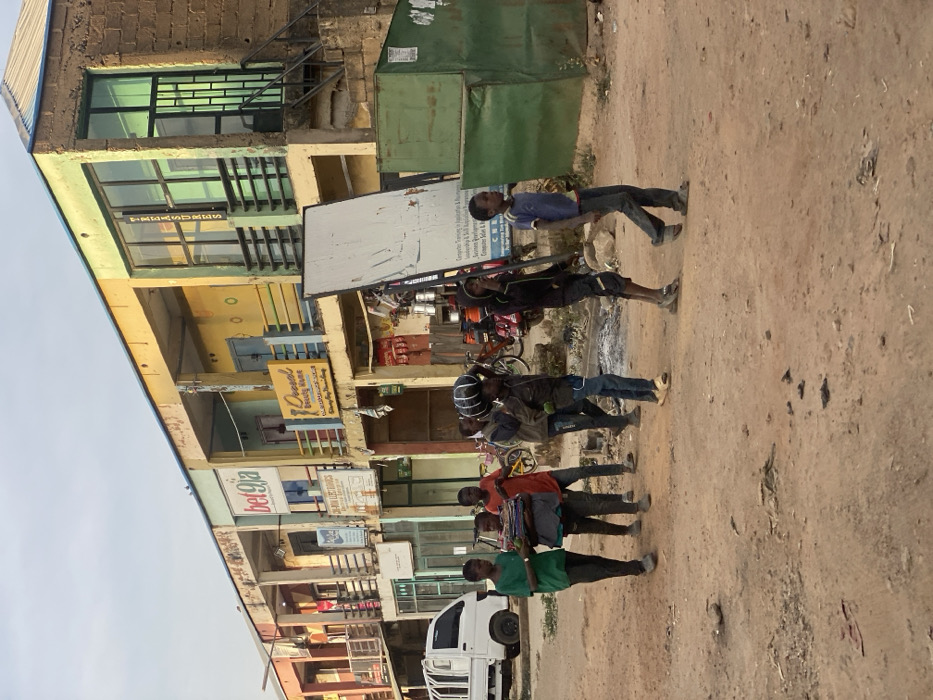 A street scene shows a group of children carrying what appears to be a large sign or whiteboard. The children are walking in a line on a dirt road. Beside them is a multi-story building, with several businesses occupying the lower levels. A truck is parked near the building. The image is slightly tilted.