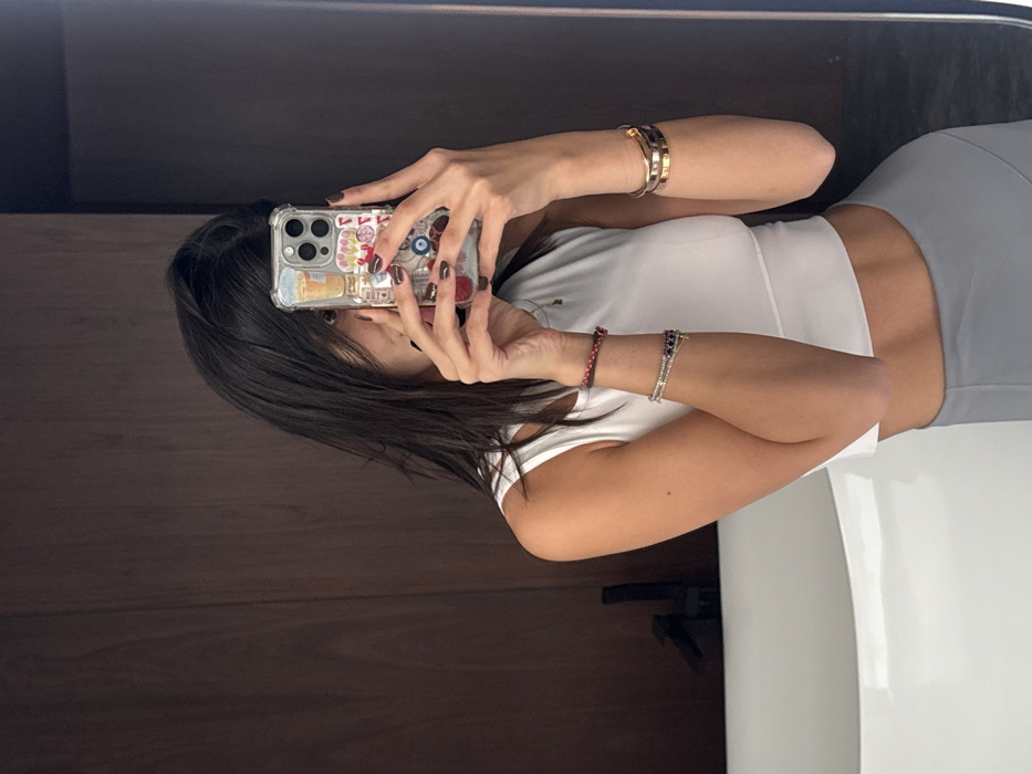 A female individual is depicted in a mirror selfie, obscuring her face with a smartphone. She has dark, shoulder-length hair and is dressed in a white sleeveless crop top and light grey athletic-style pants. Her left wrist is adorned with multiple bracelets, including a red braided bracelet and stacked beaded bracelets. Her right wrist features two gold-toned bangles. Her fingernails are painted a dark color. The smartphone, an iPhone in a clear case decorated with various stickers (e.g., coffee cup, evil eye, hearts), is held with both hands, angled to capture her reflection. The background behind the individual includes dark brown wooden paneling on the left, a white freestanding bathtub with a dark-colored faucet visible in the lower left, and a reflective surface consistent with a mirror on the right. The specific location within Interlomas, Mexico, cannot be determined from the visual information presented in the image.